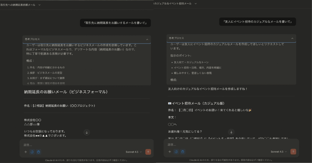 例えば、「取引先に納期延長のお願いメールを書いて」と頼むと、丁寧でフォーマルな文面を書いてくれます。一方、「友人にイベント招待のメールを書いて」と頼むと、親しみやすいカジュアルな文面になるんですよね。