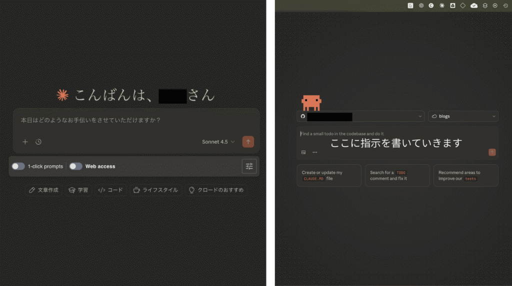 左がClaude(チャット版)で右がClaude Code。どちらもチャット形式で進められます。