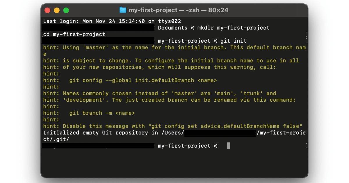 黄色い文字でターミナルに出ているこのメッセージは Git を初期化したときに表示される “初期ブランチ名に関する注意メッセージ” です。基本的に作業に影響はないので無視してもらって大丈夫です。