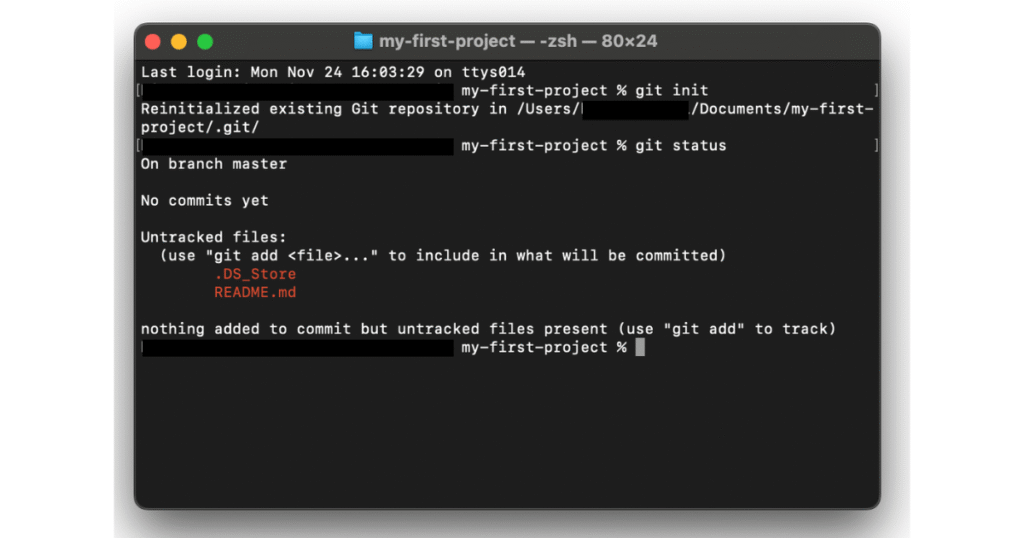 git initすると、「Initialized empty Git repository in …」というメッセージが表示されます。これで、このフォルダがGitで管理できるようになりました!
