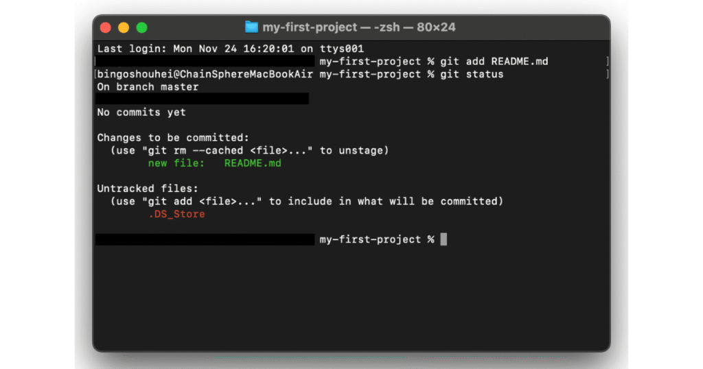 echo "# My First Project" > README.mdこのコマンドで、「My First Project」という内容のREADME.mdファイルが作成されます。