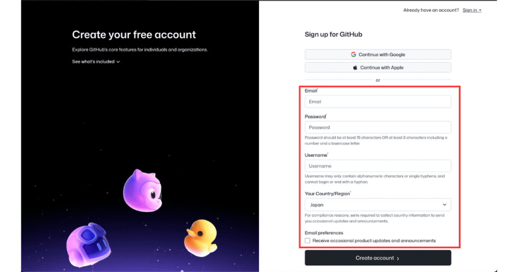 GitHubのアカウント作成は、とてもシンプルなんです。以下の手順で進めていきましょう。