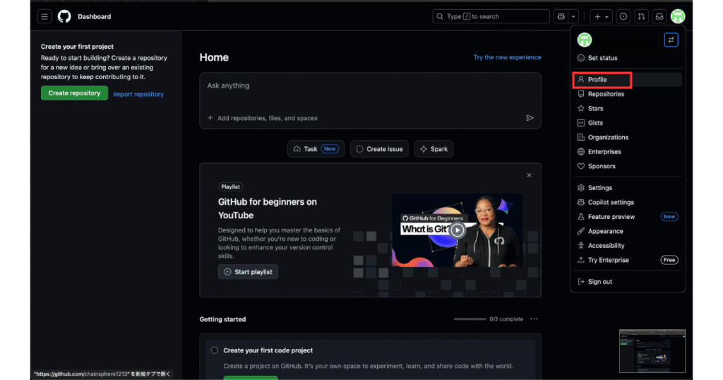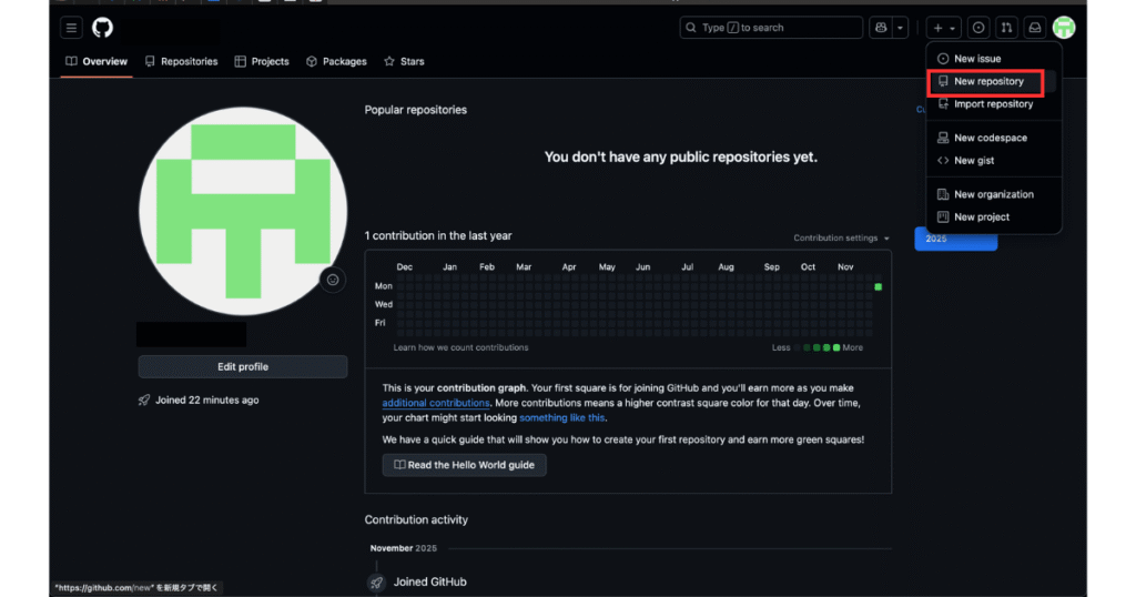 アカウントが作成できたら、次は「リポジトリ」を作ってみましょう。リポジトリというのは、プロジェクトのファイルをまとめて保存する場所のことなんです。では、実際にリポジトリを作成する手順を見ていきますね。