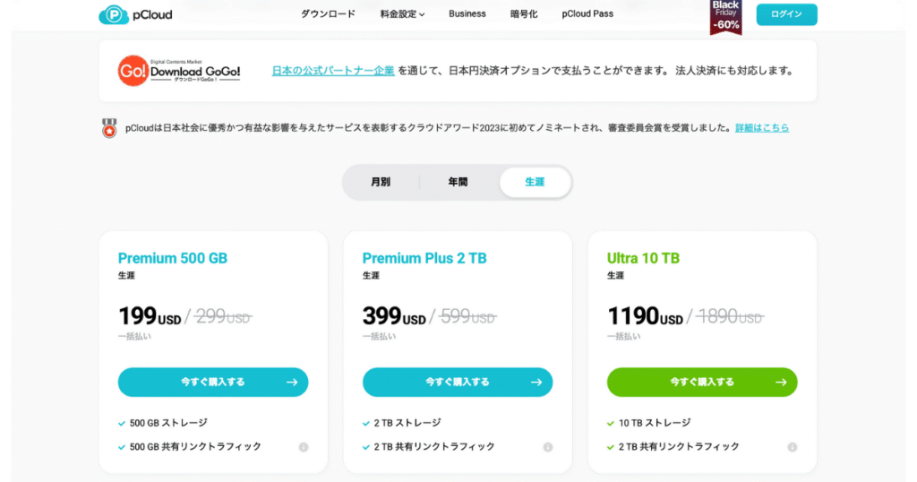 pCloudの最大の魅力が、この「Lifetimeプラン」です。