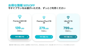 買い切りだから一度買ってしまえば一生モノ、セール中に買えば「一生分のストレージを半額で手に入れる」みたいな感覚ですね。