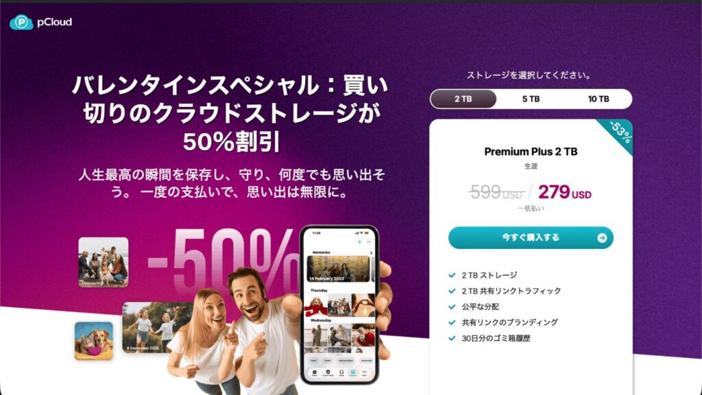 急いで買う必要はないから、少しでもお得に買いたい!という方に向けてpCloudは年に数回「最大50%以上OFF」になるセールを開催しているんです!